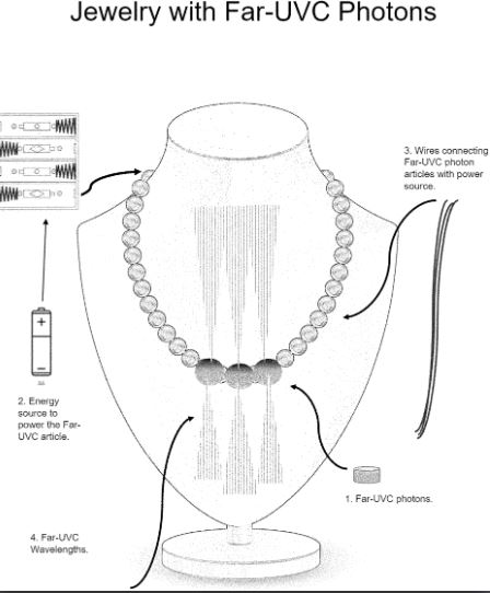 Far-Ultra-Violet C (Far–UVC) jewelry article with components thereof and other accessories is provided to protect wearer from intrusion of viruses and micro-organisms. The jewelry article is integrated with Far–UVC photons that project wavelengths of about 222 nanometers to protect against viruses. The jewelry article would be a type of necklace, bracelet, or ankle bracelet comprised of Far–UVC photons attached on the jewelry projecting sterilizing rays on surfaces at a safe distance protecting skin and eyes. Inventors Alan Cook Day and Michele Marie Day